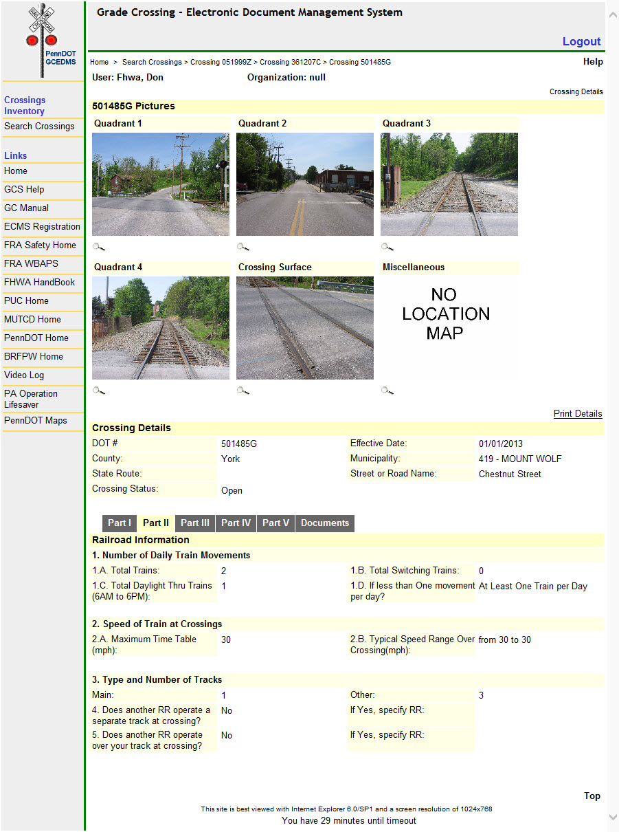 Print Details - Click this link to display the Print Crossing Details page, a printer friendly version of all information on Part I-Part V Tabs (Part I only for non-at grade crossings).